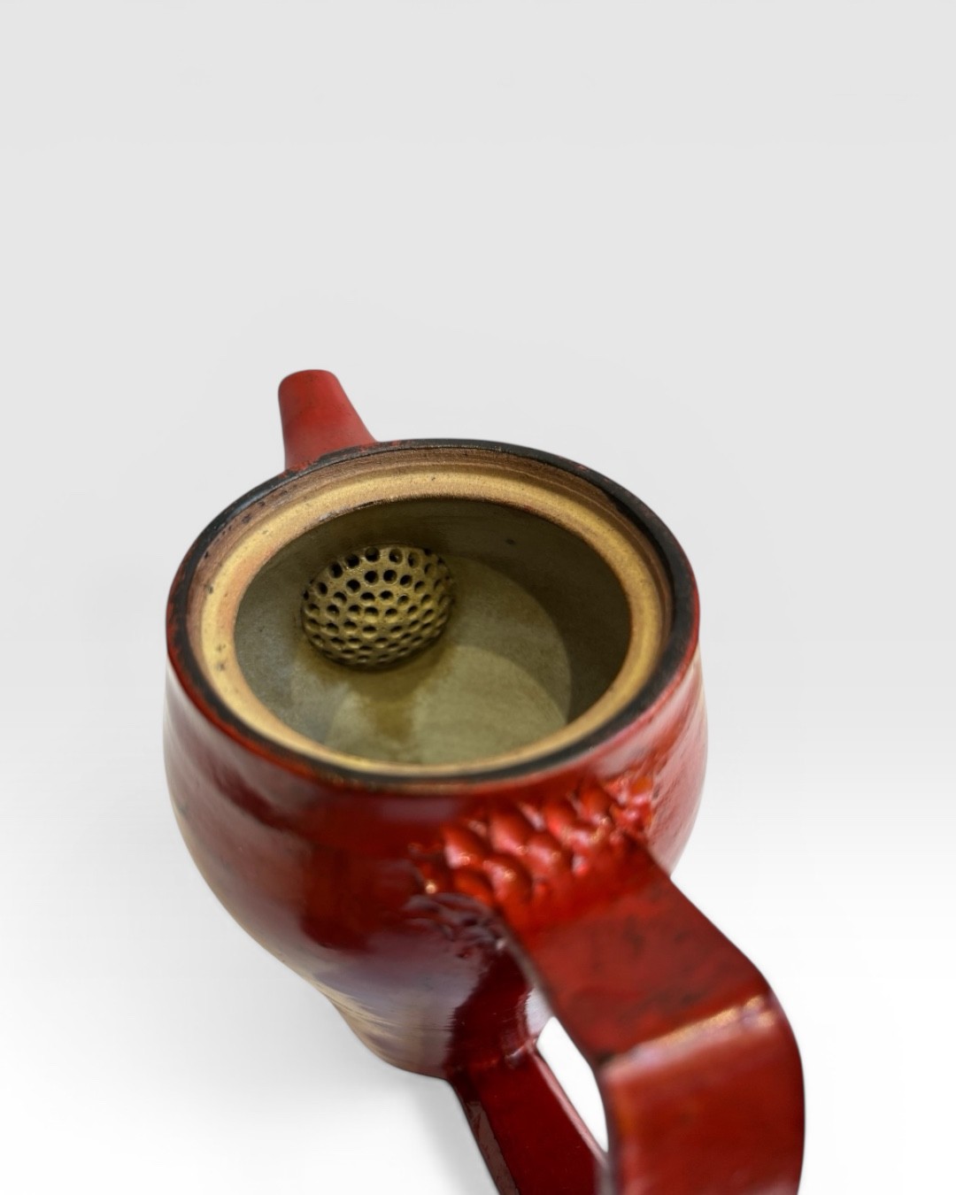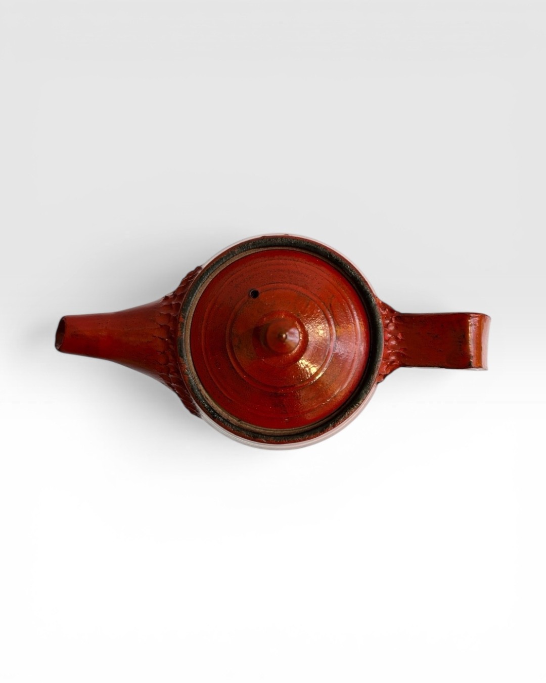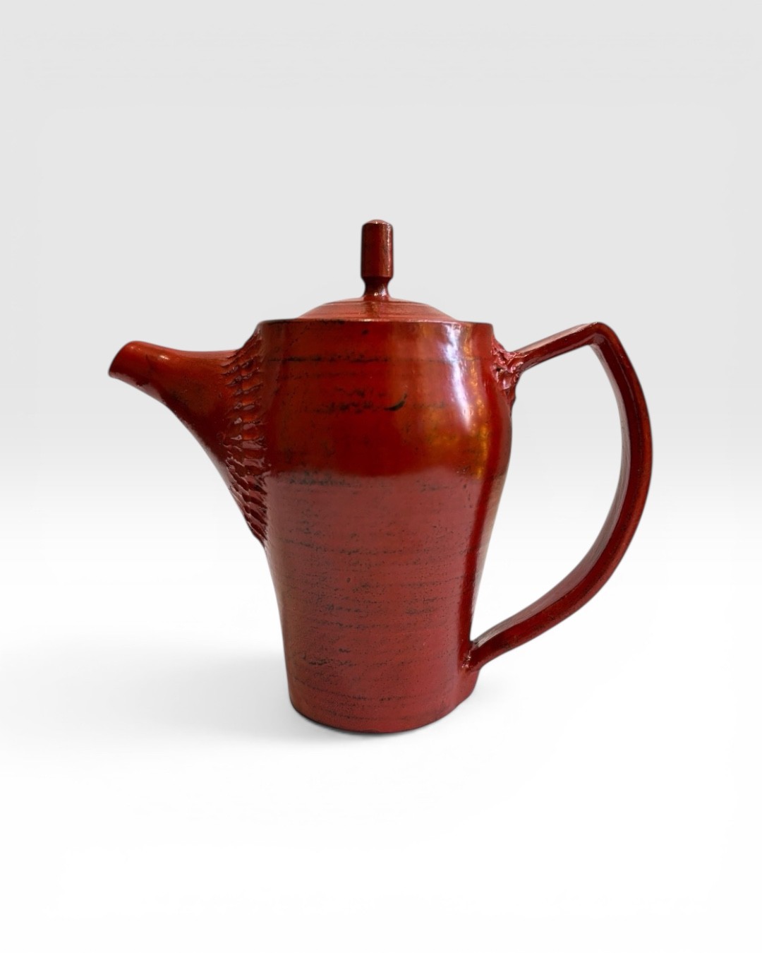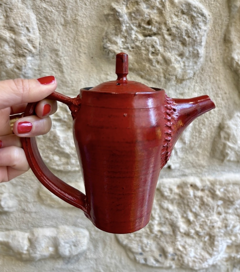 Théière en grès émaillée en noir, puis laquée en rouge. Elle a été légèrement poncée afin de faire apparaitre la couche noire.